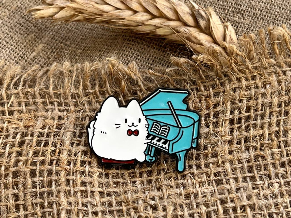 Металічны пін "Кацяня-піяніст" выдатна падыйдзе ў якасці падарунка для любога чалавека, які выконвае на клавішных інструментах, фартэпіяна. Памер значка - 2х3 см., дзякуючы надзейнай засцежцы ён будзе добра трымацца як на вопратцы, так і на заплечніку ці торбачцы.
